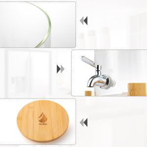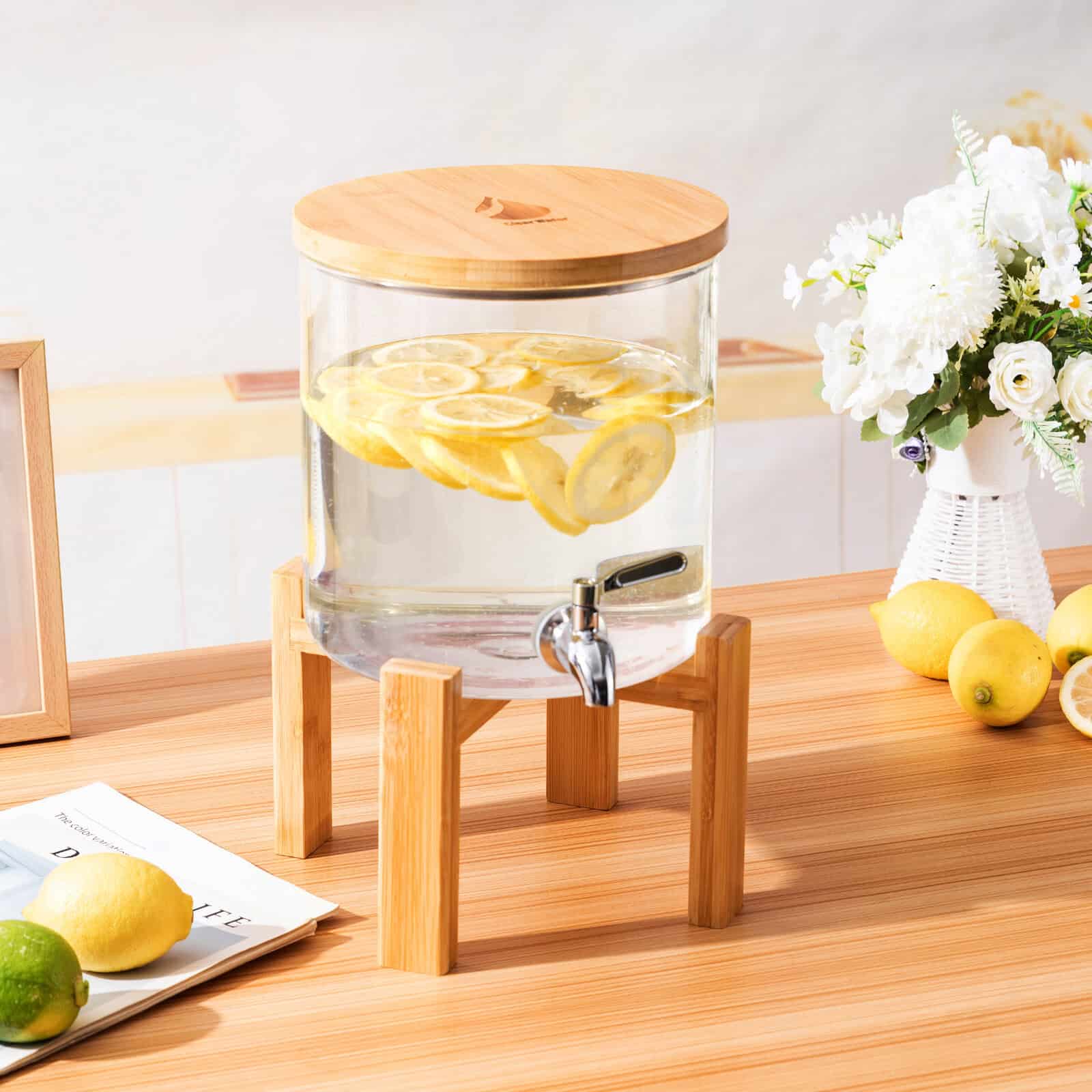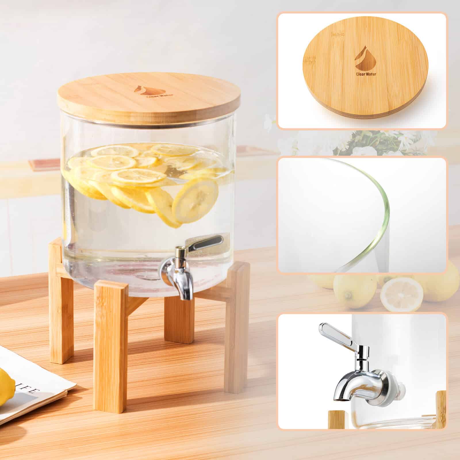 מיכל מזכוכית בורסיליקט באיכות גבוהה עם ברז עשוי נירוסטה ומעמד עץ מבמבוק.