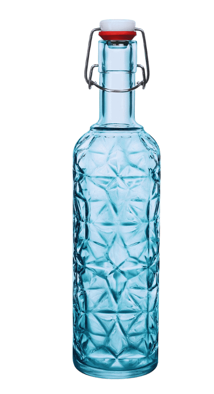 בקבוק למים מזכוכית כחולה באיכות הגבוהה ביותר, בתכולה של 1 ליטר עם סגירה הרמטית ובעיצוב יוקרתי ומיוחד.